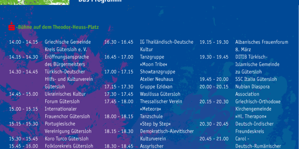 Am Samstag, 19.08.2023, tritt von 15.00 - 15.15 Uhr der Internationaler Frauenchor Gütersloh auf und von 15.30 - 15.45 Uhr der Koro Turcu Gütersloh.