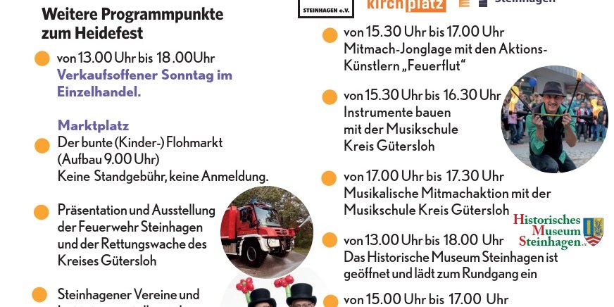 Das erste Wochenende im September ist in Steinhagen immer ein ganz besonderes, denn es finden wieder das Heidefest statt. Für beste Unterhaltung ist am gesamten Tag gesorgt: Sei es mit Tanz, Musik, kulinarischen Begegnungen und vielem mehr.